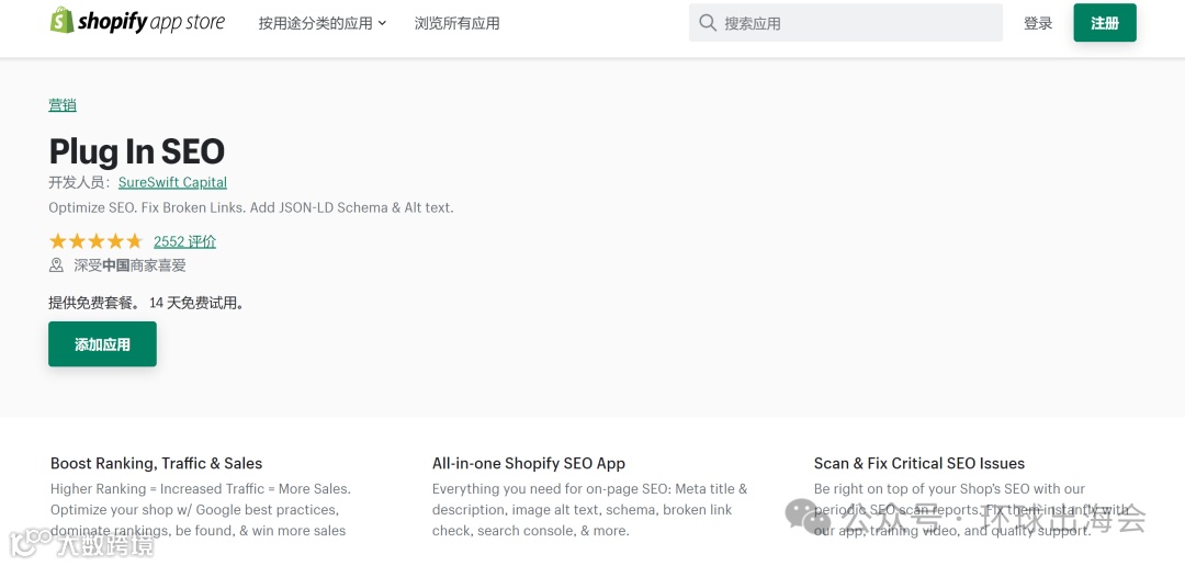 20. Plug In SEO:自动化SEO检测工具,扫描页面标题、描述、结构与加载速度问题,帮助提升搜索引擎排名[k]。已被超9万家Shopify店铺采用[k]。