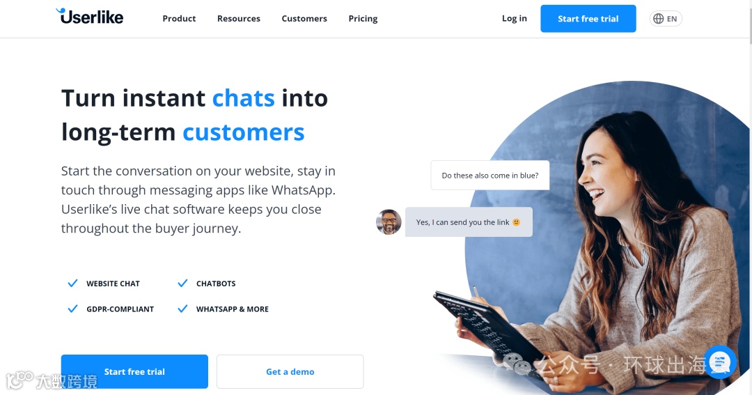 22. Userlike:实时在线客服系统,支持网站聊天、WhatsApp、Messenger与SMS沟通[k]。免费版支持单坐席,付费套餐$90–$720/月,含聊天机器人与分析功能[k]。