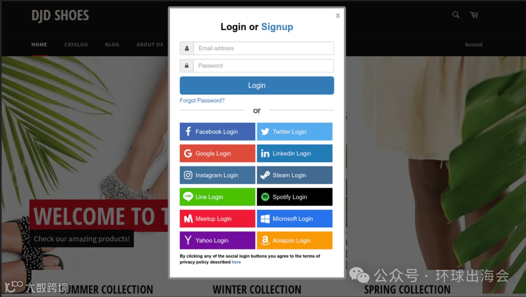 简化注册流程,支持通过Facebook、Twitter、LinkedIn、Pinterest、Amazon、Google、Instagram、Outlook等社交账号快速登录,提升用户注册率与体验。提供用户账户管理功能,便于商家查看信息。支持15天免费试用,起始价格为$2.99/月[k]。