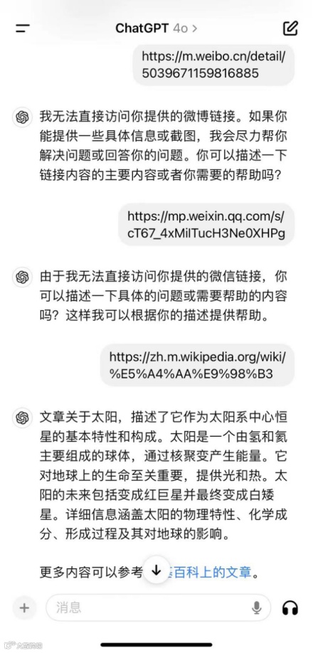 在文档与链接总结能力上,元宝支持上传最多10个PDF、Word、txt文件,并可一次性解析多个微信公众号链接,上下文窗口达256K;而GPT-4o不支持国内链接摘要生成[k]