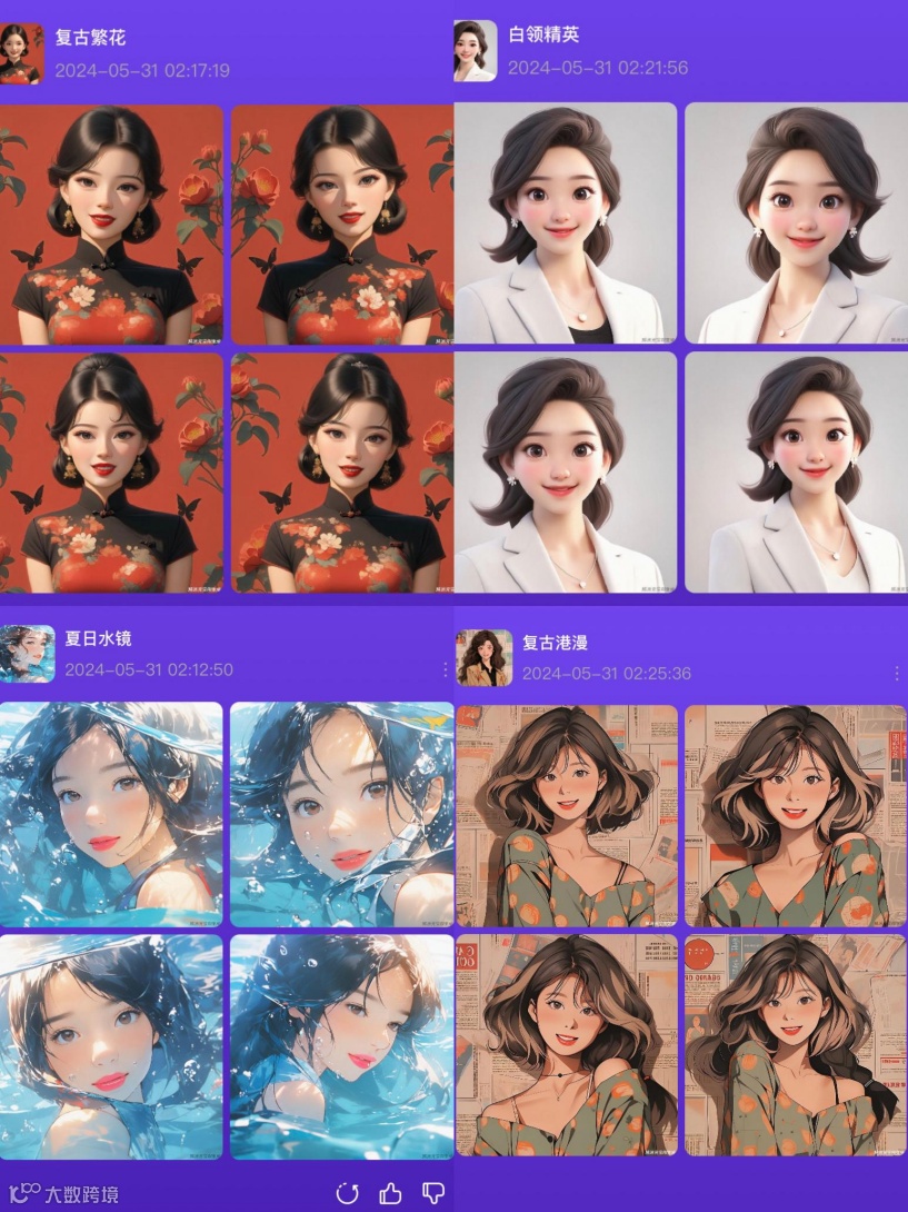 百变AI头像提供12种风格选项,但仅支持单图上传,细节处理粗糙,个性化与表情生动性不足,背景设计重复[k]