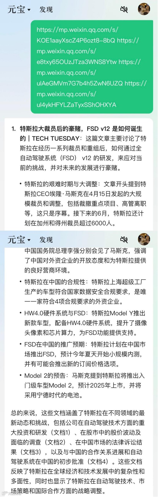 测试中,元宝成功解析四篇微信公众号文章,准确提炼各篇要点并揭示其逻辑关联,展现强信息整合能力[k]