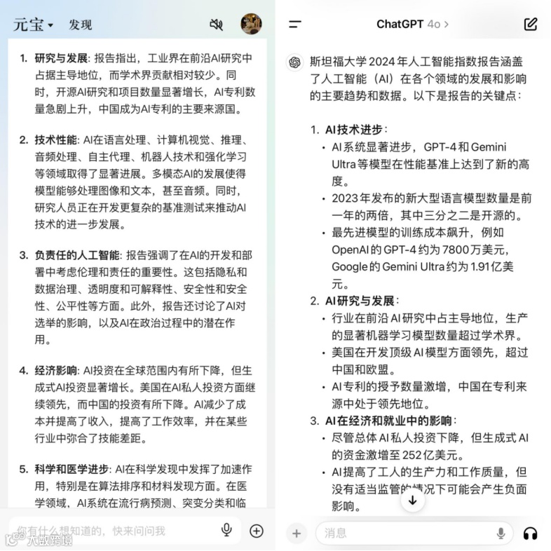 但在信息深度方面,GPT-4o表现更优,其回答结构清晰、数据详实、论证有力;元宝观点拆分较粗,缺乏具体数据支撑[k]