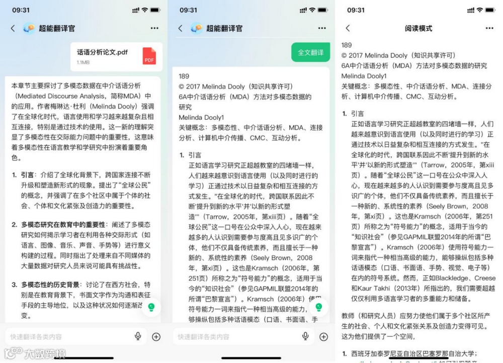 超能翻译官支持文件、语音、文字、图片、链接五种输入方式,可识别15种语言,具备全文翻译与要点提炼功能,适用于学术与专业场景[k]