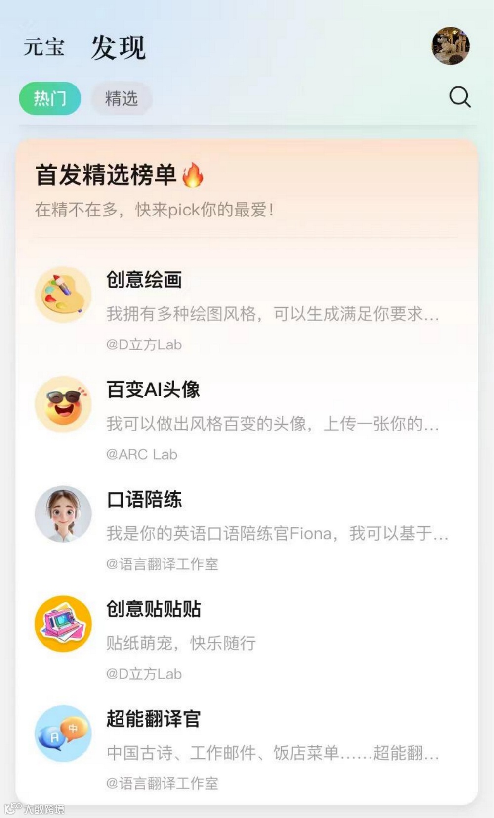 元宝“发现”栏目集成百变AI头像、口语陪练、超能翻译官、AI智能体等功能,强化生活化体验[k]