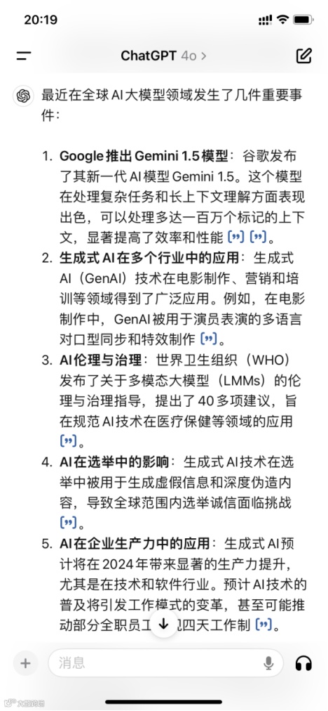 在“全球AI大模型近期重大事件”搜索测试中,腾讯元宝分类呈现答案,并提供24篇近一周内的参考文献,来源涵盖微信公众号及权威网络资源,信息时效性与可追溯性显著优于GPT-4o(仅6篇,含年初资料)[k]