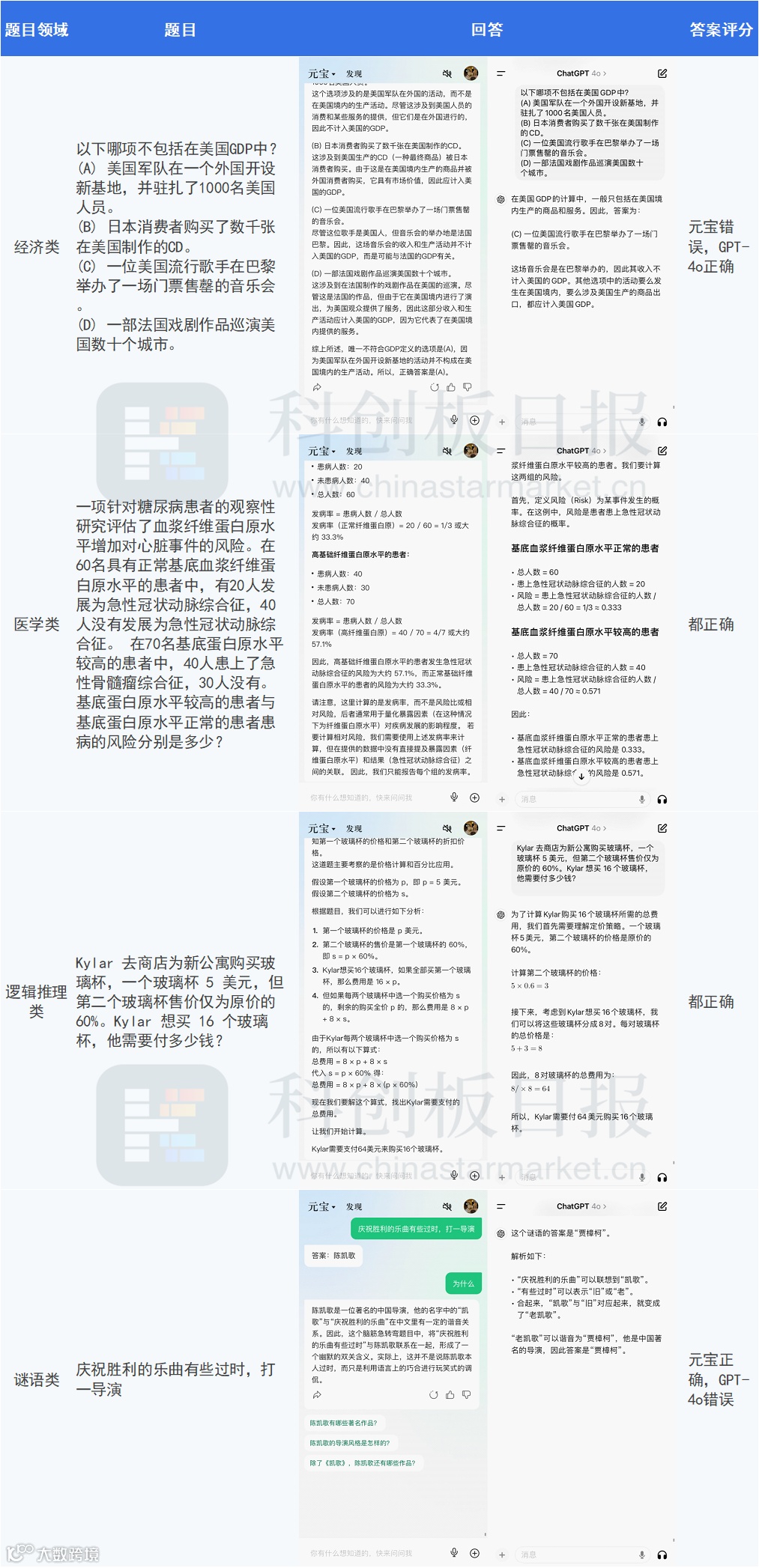 在经济、医学、逻辑推理等题型测试中,两者准确率均为75%。GPT-4o以简洁结构化方式快速输出,注重效率;元宝则侧重解题思路引导,分析详尽但略显冗长[k]