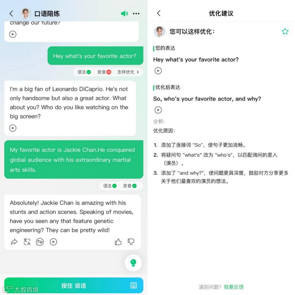 口语陪练方面,元宝模拟1V1对话,对语法与发音打分,并提供个性化改进建议(如“what's”改为“who's”),更适合深度学习用户[k]