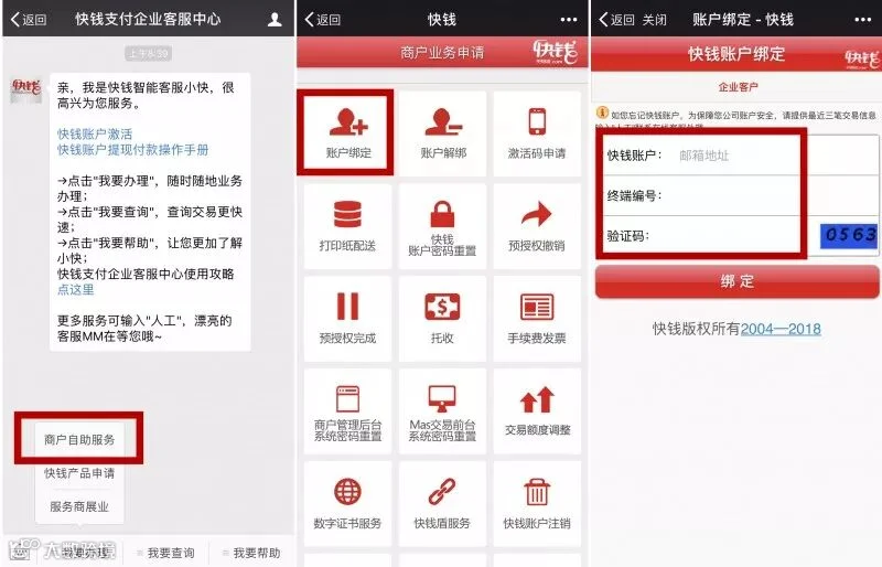 2、点击菜单“商户自助服务”,进入“账户绑定”页面,输入商户快钱账户,需要接受交易通知的终端号及验证码,完成终端绑定;