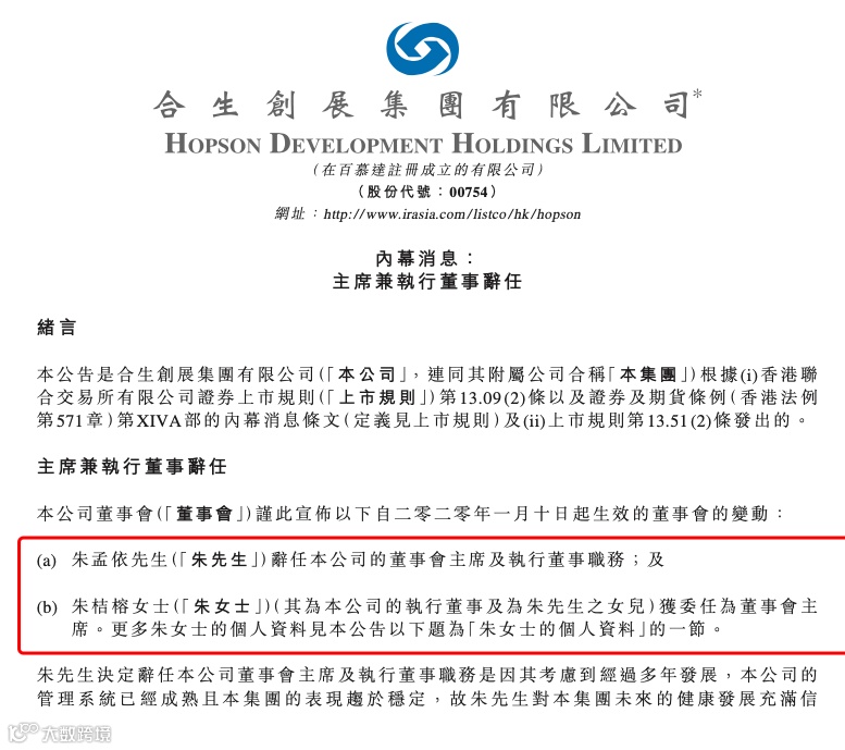 尽管曾被视为合生创展接班人,但朱一航并未进入公司管理层。2020年1月,朱孟依卸任董事会主席,由其女朱桔榕接任[k]。