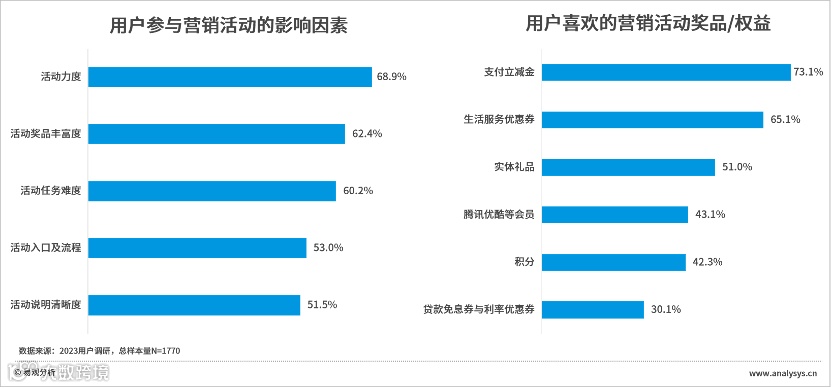 从参与信用卡APP营销活动影响因素看,用户更加关注活动入口及流程、活动说明清晰度、活动奖品丰富度、活动力度(奖品的吸引力及奖品使用便捷性)、活动任务难度等。根据易观调研数据显示,活动力度、活动奖品丰富度是用户是否参与活动最主要的影响因素;从用户奖励偏好看,用户偏好高的活动奖品包括支付立减金、生活服务优惠券(餐饮代金券/电影券/打车券/商城优惠券/话费券等)。