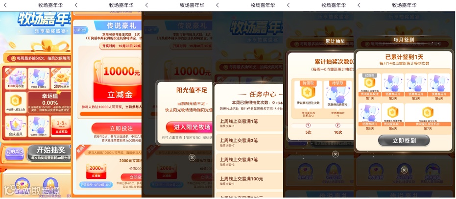 阳光惠生活APP“牧场嘉年华”活动采取“抽奖”方式,用户每周完成交易类任务或进入“阳光牧场”完成浏览类任务可获得抽奖机会,在活动首页点击【开始抽奖】按钮可进行抽奖。每一次抽奖幸运值均会增加,当幸运值未达到100%时,可抽中1元立减金、盲盒、碎片、碎片合成道具、传说豪礼投注机会;当幸运值达到100%时,可抽中极品奖励或超凡奖励。集齐指定数量碎片,加一张合成道具,可兑换盒马鲜生、肯德基、麦当劳、天猫超市优惠券。获得的传说豪礼投注机会,用户可在活动首页下方大奖投注,奖品开奖时间为每月8日、18日、28日20点整。