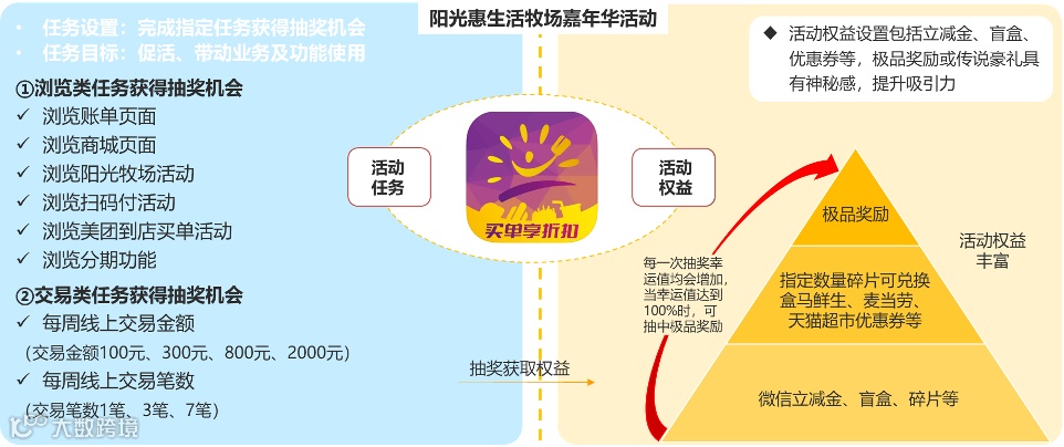在活动场景中抽奖投注均需要消耗阳光值,如阳光值不足时,用户可以到“阳光牧场”赚取相应阳光值,同时,用户还可以通过完成“阳光牧场”碎片任务,获取嘉年华抽奖次数。此外,用户在完成“阳光牧场”浏览任务时,助力提高账单、分期、美团到店、商场等各类场景的活跃度,进而提升转化率。