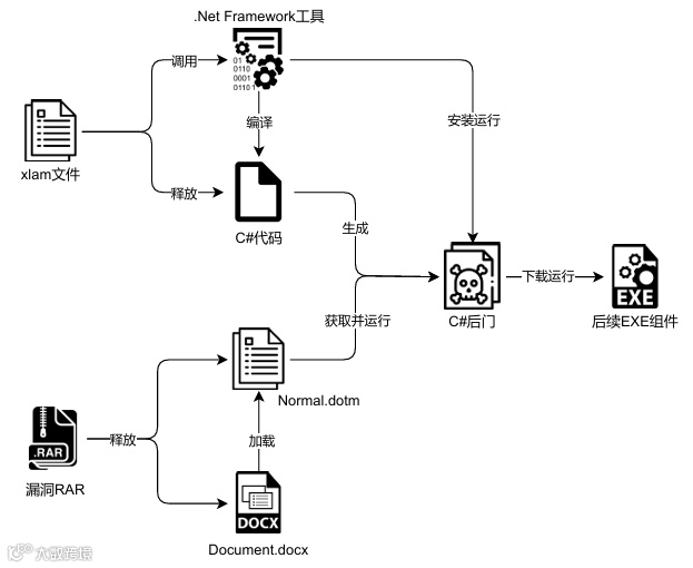 (1)方式一:利用 xlam 文件携带的 VBA 宏释放 C# 代码文件,借助受害者机器上.NET 框架的 csc.exe 和 InstallUtil.exe 完成编译与安装。