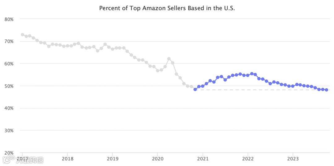根据 Marketplace Pulse 研究,亚马逊美国市场上排名靠前的第三方卖家中有 48% 是美国企业,48%也是有史以来的最低水平。