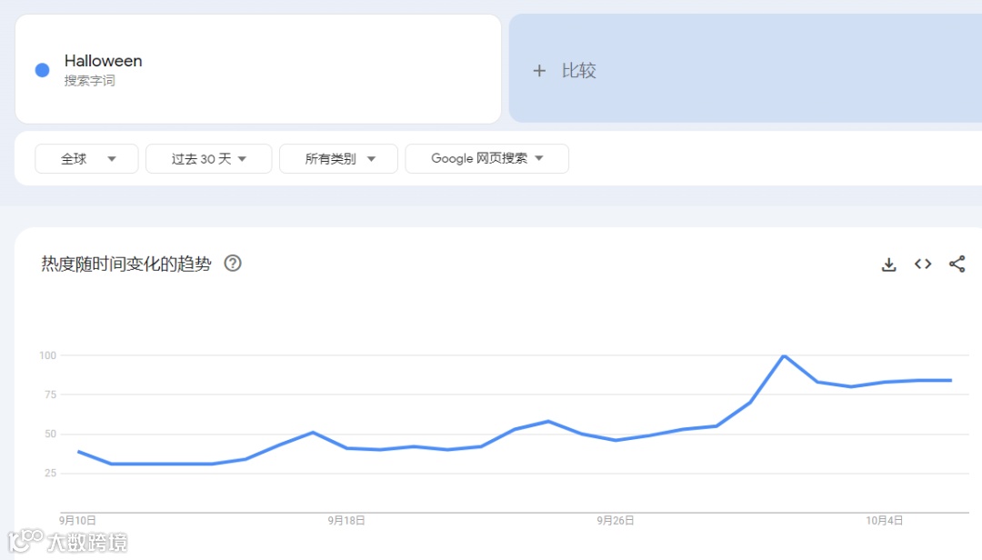 根据谷歌趋势数据显示,近30天内,“Halloween”的全球范围内搜索热度达到80——100,美国、爱尔兰、加拿大、英国等国将万圣节庆祝活动看地尤为重要。