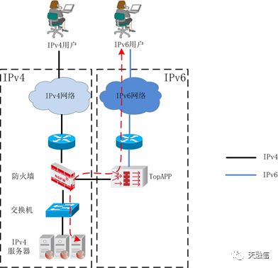 用户在真正实现IPv4/IPv6双栈环境的改造之前,采用天融信应用交付的下述解决方案可以快速的实现网站支持IPv6。