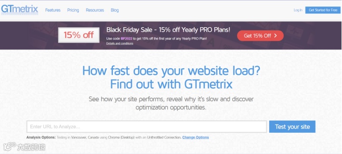 GTmetrix作为经常被使用的网站测速分析工具,也具有十分便捷的操作系统,使用页面简单并且其功能较多,在把网址输入完毕后,点击“ Test your site ”即可。