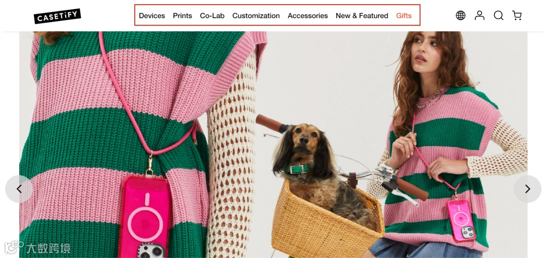 打开CASETiFY的网站,便能感受到铺面而来的活力与创造力,这也正是他们的品牌内涵。从网站页面设计来说,导航栏划分清晰,电子产品、经典印花、联名系列、个性化设计、配件、新品&精选商品、暖心礼物等几个分区,可以快速帮助消费者找到想要的商品。同时,网站还有艺术家设计款、环保与可持续发展等细分类目,照顾不同消费者的需求。