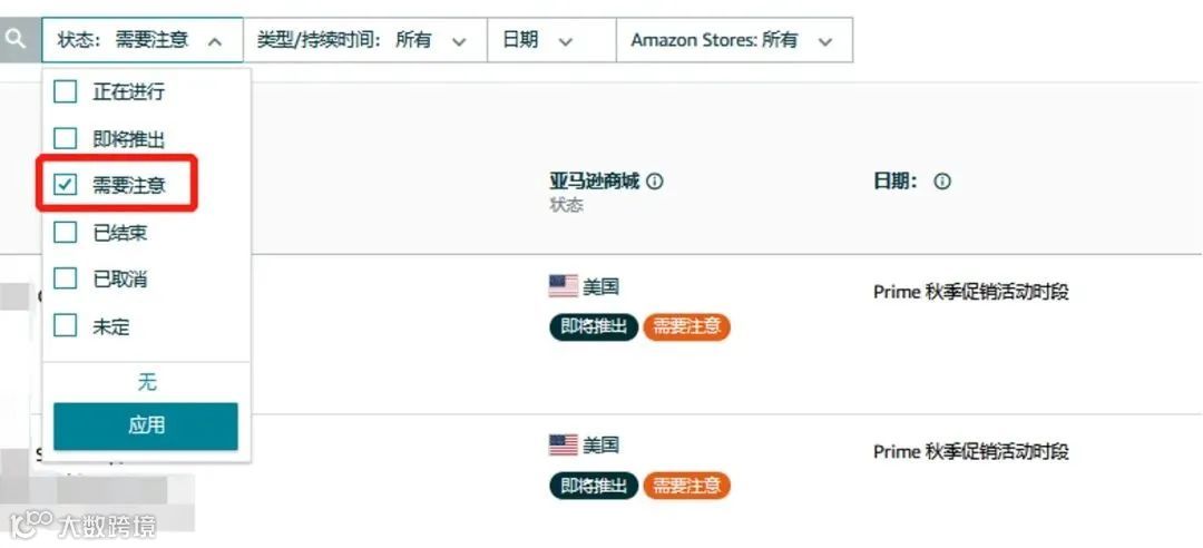卖家平台 -> 广告 -> 秒杀 -> 筛选出状态为“需要注意”的Deal活动