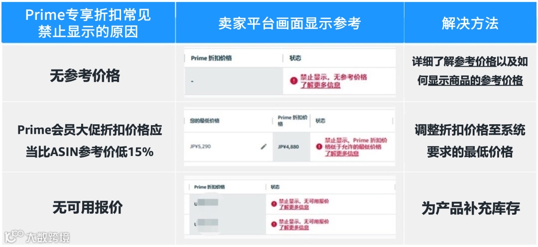 卖家平台 -> 广告 -> Prime专享折扣 -> 在“状态”栏中查看非正常状态的商品,点击“查看详情”