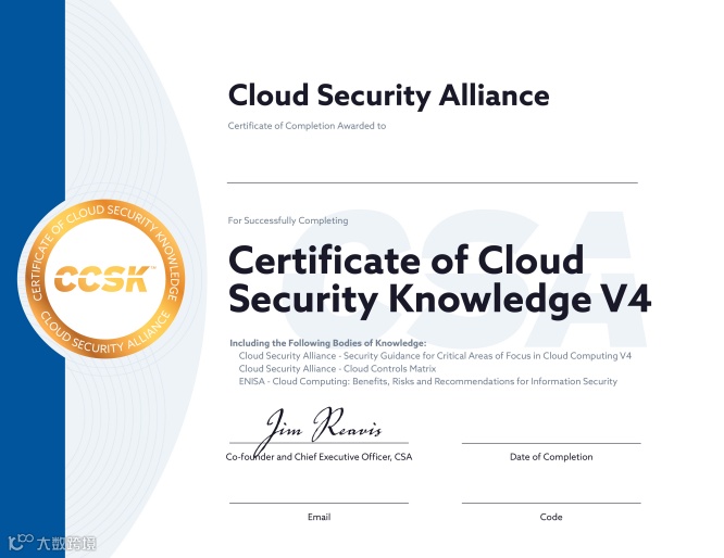 云计算安全知识认证(Certification of Cloud Security Knowledge, CCSK)是云计算领域面向个人用户的全球首个安全认证,旨在确保与云计算相关的从业人员对云安全威胁和云安全最佳实践有一个全面的了解和广泛的认知。涵盖了体系结构、合规治理、加密和虚拟化等主题。