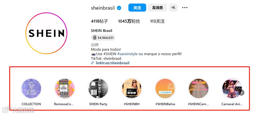 众所周知,拉美网民是社交媒体重度用户,而这也让SHEIN获得了高质量的线上营销。SHEIN Instagram主账号坐拥3055万粉丝,巴西账号也拥有1045万粉丝,从主页面我们可以看到,SHEIN会根据营销话题在主页进行分栏目展示,用户可以直接点击查看近期的营销内容。