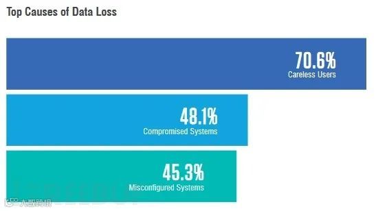 数据丢失在各个国家和行业中表现出的普遍性引出了一个显而易见的问题:是什么导致了所有这些事件?此次调查给出了一个令人惊讶的答案,超过70%的受访者将「粗心的用户」(包括普通员工、IT工作者和承包商/供应商)视为导致数据丢失最主要的原因。粗心大意的表现包括以下几种: