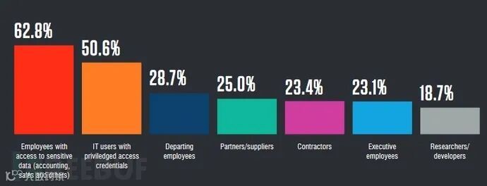 其他被视为数据丢失最大威胁的群体还包括离职员工(28.7%)、合作伙伴/供应商(25%)、承包商(23.4%)、高管员工(23.1%)以及研究人员/开发人员(18.7%)。
