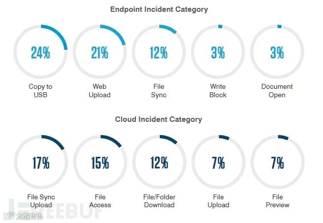 来自粗心、脆弱或恶意用户的威胁同样反映在Proofpoint信息保护平台上触发的各种数据警报中。在端点中,几乎一半的警报是由将文件复制到USB(24%)或将其上传到网络(21%)引起的。顶级云事件分布更加均匀,各种文件上传和访问操作相对均衡地排在前五位。