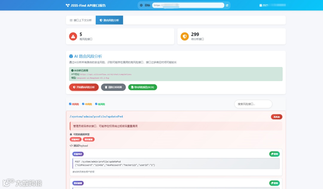 获取接口清单后,集成AI大模型(如DeepSeek)将对接口进行智能分析。它能理解代码上下文,自动推断接口功能、请求方法(GET/POST等)、参数类型,生成高可行性的测试用例和Payload。例如,它能识别 /api/user/login接口需要username和password参数,自动填入合理的测试值,避免盲目Fuzz。