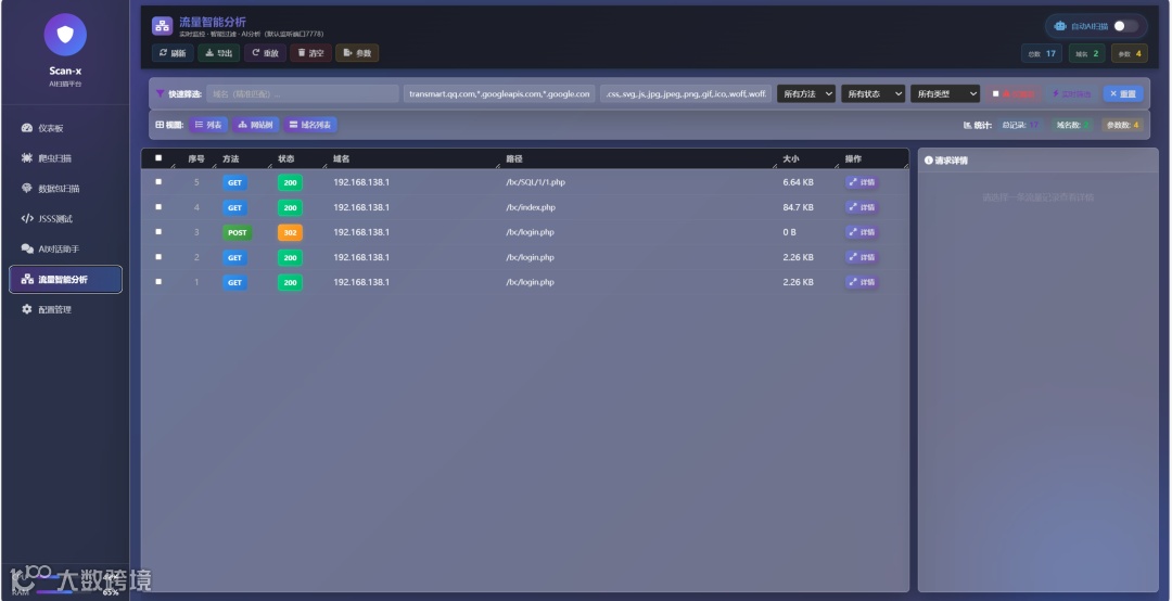 Scan-X内置流量代理与分析模块(默认端口7778),可无缝对接Burp Suite记录、筛选、重放与分析HTTP/HTTPS流量,增强被动测试能力。