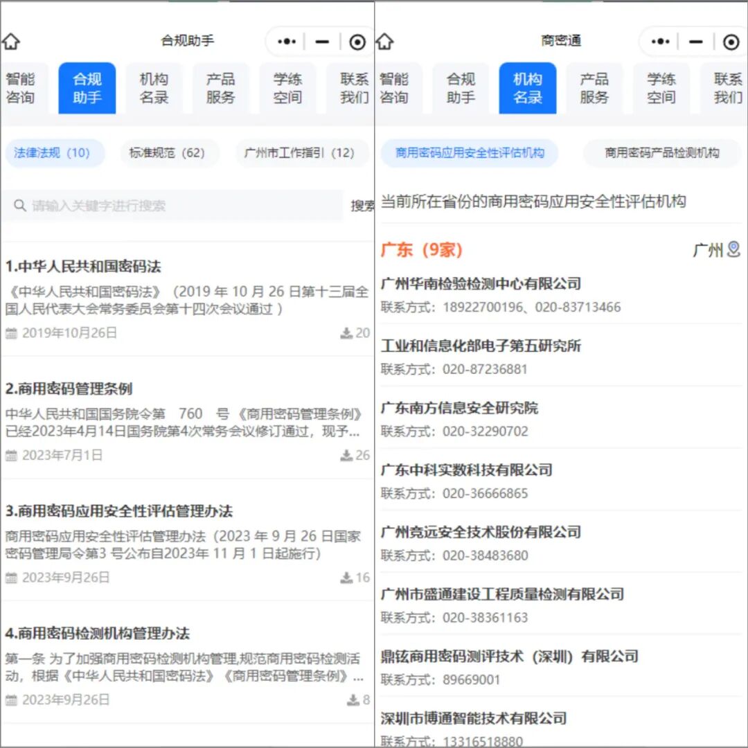 权威指导:平台在广州市密码管理局指导下建设,所有内容均来自于合规文件,确保与国家密码政策、地方工作要求保持一致,是各单位开展商密工作的“合规指南针”;