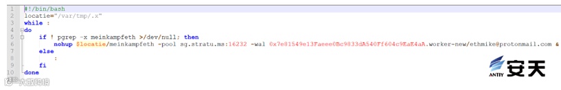 script脚本的作用是执行/var/tmp/.x目录下的挖矿程序meinkampfeth,矿池地址为sg.stratu.ms:16232,钱包地址为0x7e81549e13Faeee0Bc9833dA540Ff604c9EaE4aA。