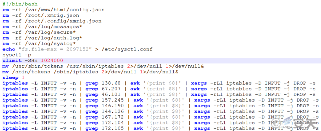 删除挖矿相关配置文件及系统日志文件,销毁攻击证据;提升系统文件句柄上限(fs.file-max)优化挖矿性能,并封锁竞争对手矿池IP段,确保设备算力专用于攻击者控制的矿池。