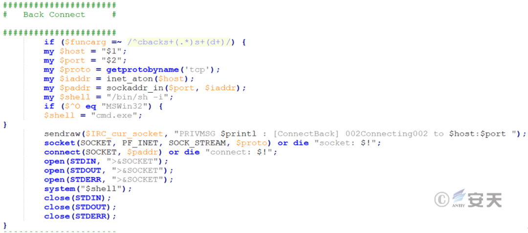 IRC bot后门连接模块,解析IRC命令参数,判断操作系统类型,Linux/Unix使用/bin/sh -i,Windows使用cmd.exe,并主动建立一个TCP连接到攻击者指定的主控端口。
