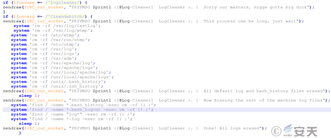 IRC bot日志清理模块,功能是删除被入侵主机上的各种日志文件以掩盖入侵痕迹。