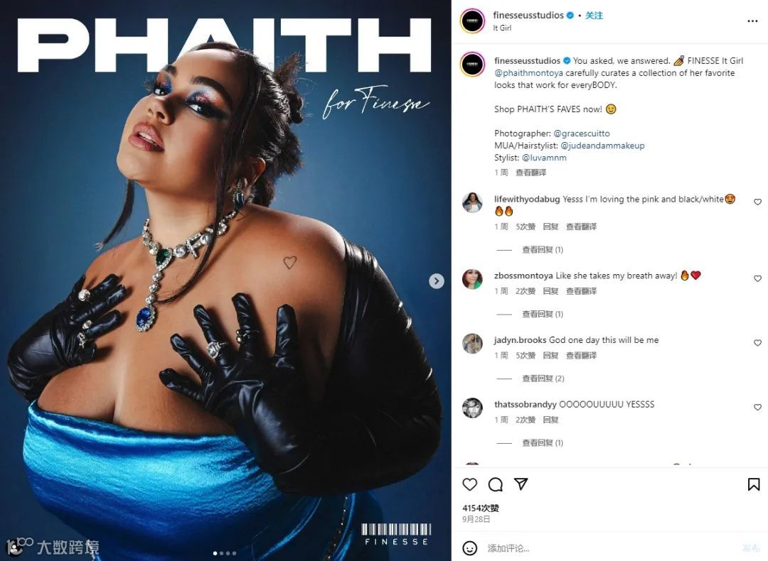 在 Instagram 上,FINESSE 主要通过发布帖子和短视频进行推广。品牌每天会更新1-3条互动内容,主要包括新品发布、KOL 合作和日常运营。FINESSE 与中腰部的 KOL 进行合作推广比较频繁,比如最近就签约了粉丝数在47.4万的大码女装博主 @phaithmontoya。此外,还会与亚裔和拉美面孔的 KOL 有合作,以此展示品牌强调多元和包容的主张,并吸收不同圈层的粉丝关注。