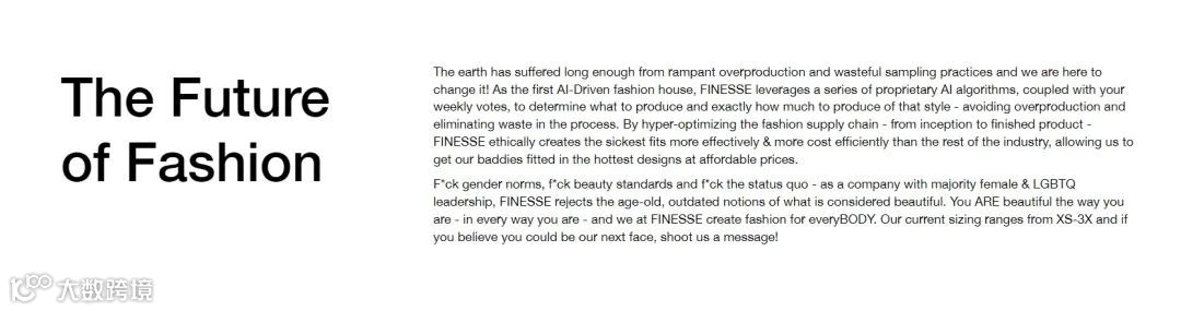 其三,关注品牌背后的意义。新消费群体不仅看重产品本身,也会考察品牌的道德形象、价值观等。正如上文所说的,FINESSE 是一家强调多元、包容文化,重视女性关怀和少数群体(LGBTQ、大码女性等)的品牌。此外,还主张通过 AI 预测、AI 出款、投票机制等来避免过渡生产造成的浪费和环境破坏问题。因此,FINESSE 作为一个注重社会责任和可持续发展的品牌,更能获得年轻一代消费者的认可和青睐。