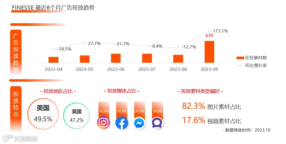 在投放地区上,FINESSE 以美国和英国为目标市场,投放占比分别为49.5%和47.2%。投放渠道上,主要选择 Facebook 系媒体。在投放的素材类型上,FINESSE 运用图片素材较多,占比高达82.3%。其次是视频素材,占比为17.6%。