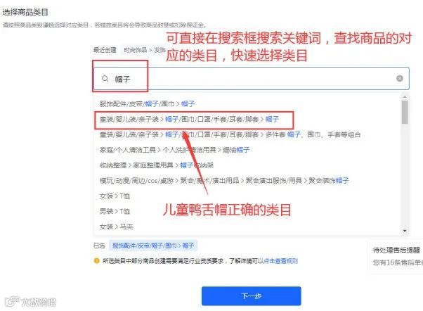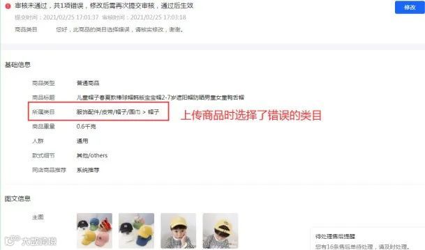 例如儿童鸭舌帽应归属“童装/婴儿装/亲子装”下的“帽子”类目,若误选为“服饰配件/皮带/帽子/围巾”,将导致审核失败[k]