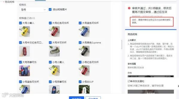 当提示需提供商标授权或品牌资质时,表明该商品可能涉及品牌侵权。对于拥有正规商标权的品牌(如南极人、百事可乐、北极绒、浪莎、心相印等),即使为贴牌或相似设计,也应避免上架[k]
