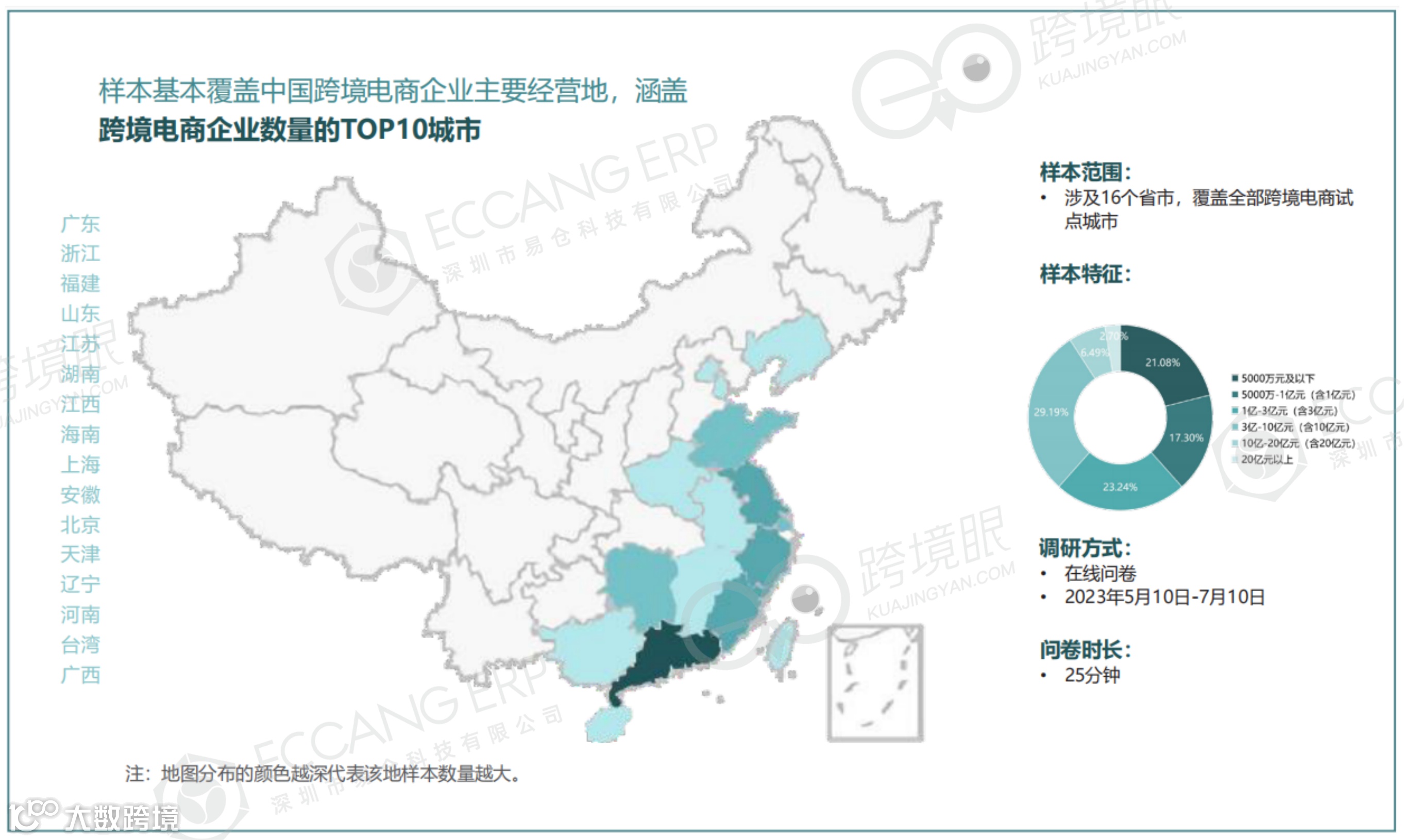 2023年5月,跨境眼观察与易仓科技采取问卷调查的形式,面向跨境电商企业主和人力资源负责人发放问卷,历时2个月,样本覆盖16个省市,囊括全部跨境电商企业集中地,包括跨境电商企业数量排名前10的城市,共收回有效问卷560份,调研数据20000多个。据此形成本报告。