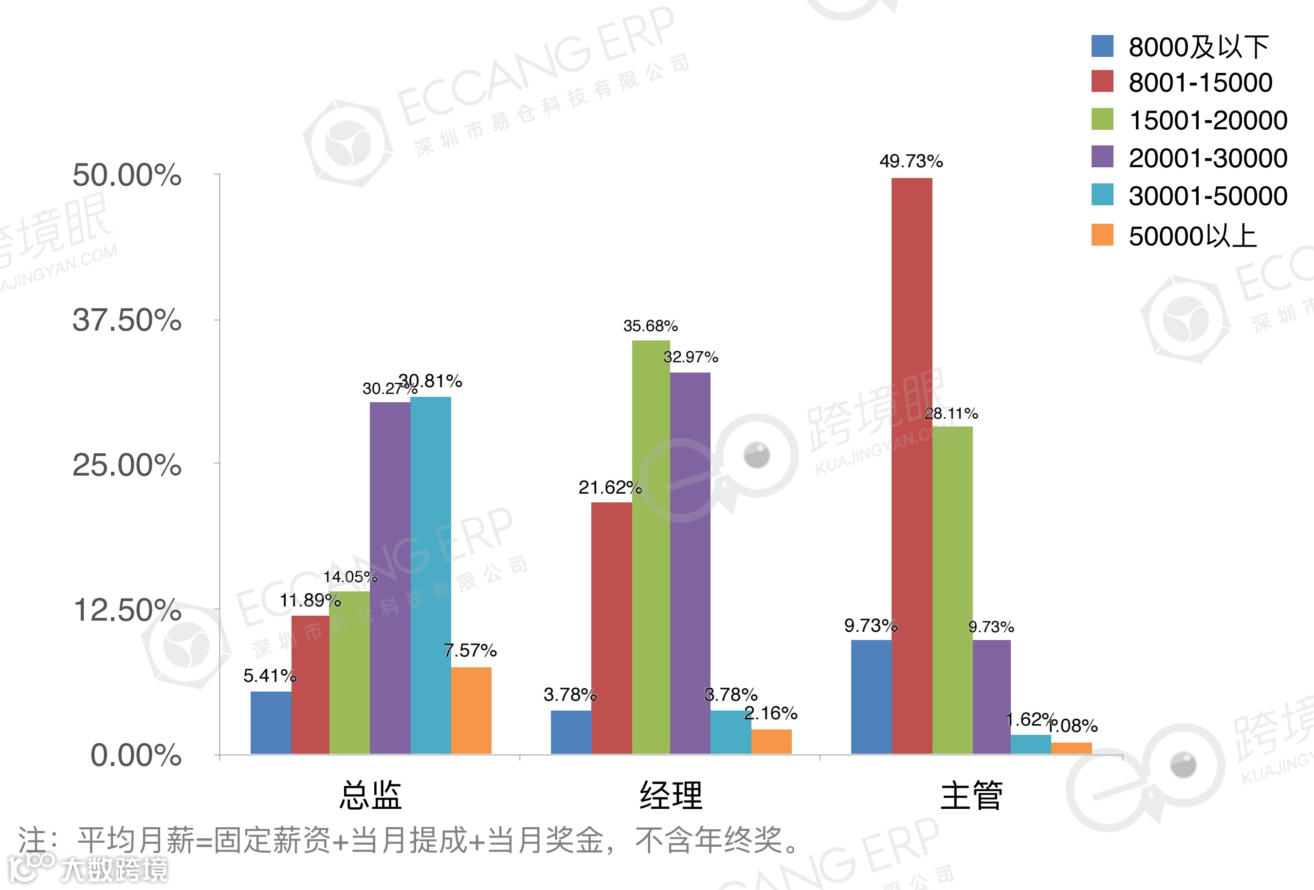 从跨境电商企业管理序列的整体薪酬水平和走势来看,各级管理者薪资水平已经形成相应的区间范围,并初步呈现出两极分化的状态,即8000元及以下的薪资区间占比和50000元以上的薪资区间占比,都有所增加。如下图