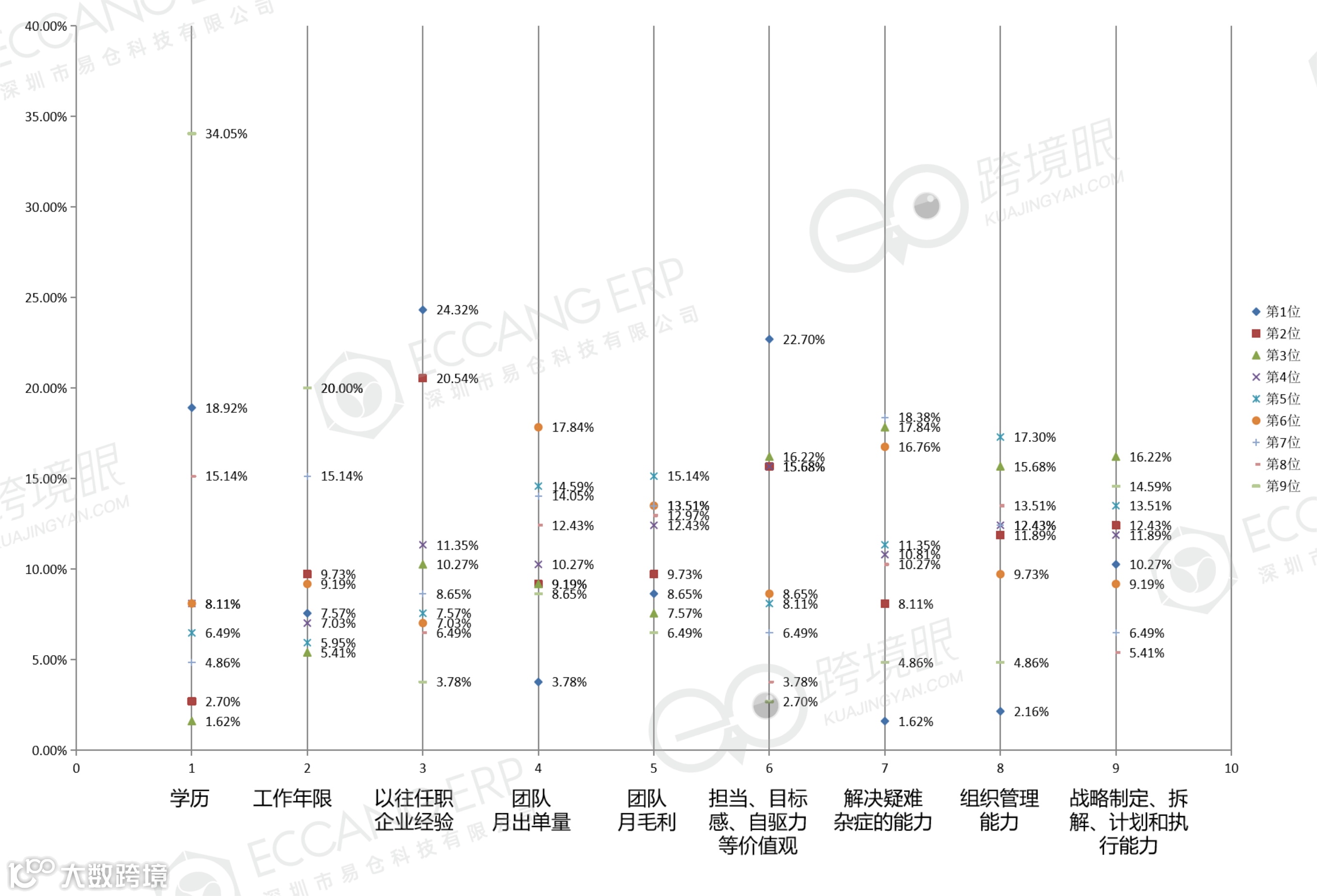 其中,对于“学历”这一选项的排序,呈现两极分化的状态,一方面,这一选项被18.92%的受访者排在第1位,另一方面,有34.05%的受访者将其排在最后一位。过去跨境电商行业“草根”创业者居多,随着行业空间的不断扩大和竞争的白热化,加之其他成熟行业的人才流入,不少自带“学历光环”的人才也随着这股潮流进入跨境电商行业。