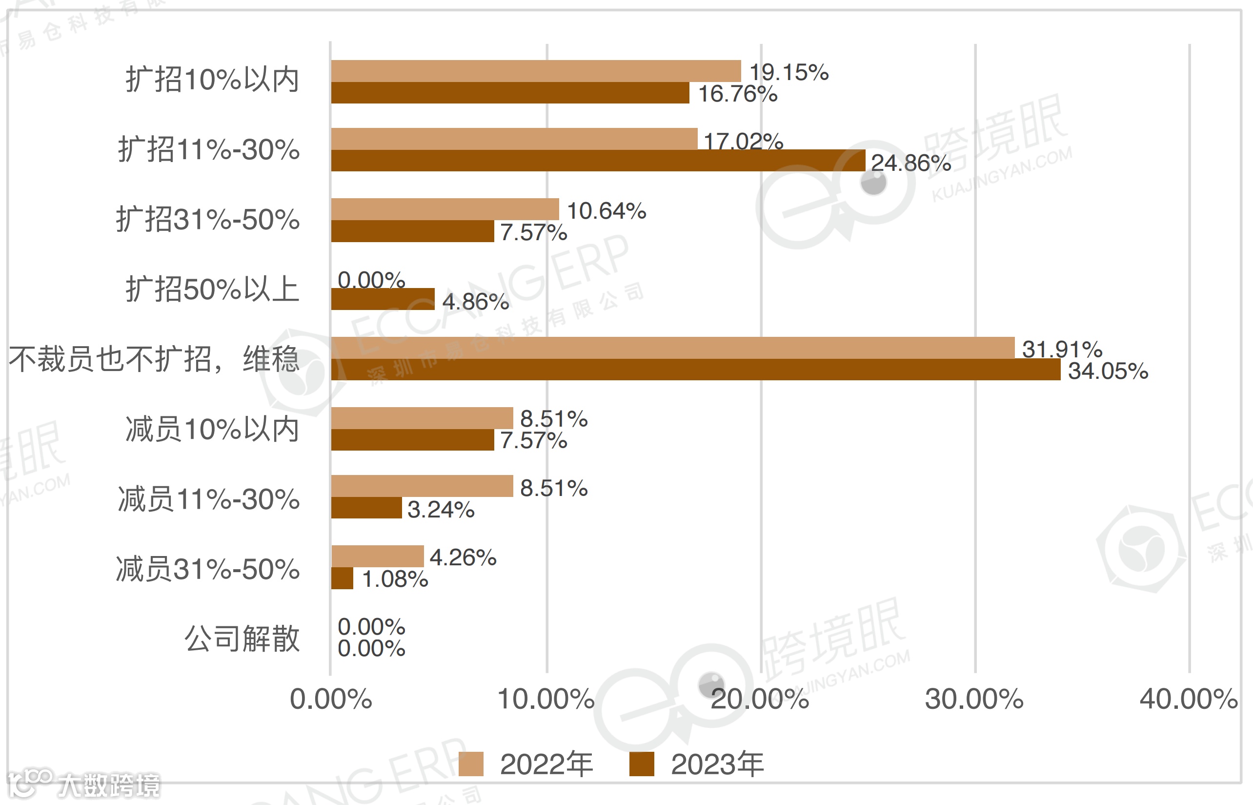 2022年企业招聘回暖,主要表现在三个方面:第一,2023年减员的企业在减少,整体占比11.89%,相比2022年的21.28%降低了近1成;第二,2023年扩招的企业在增加,整体占比达到54.05%,达到样本企业的一半以上,且扩招10%以上的企业达到近4成;第三,2023年扩招50%以上的企业占比4.86%,2022年这个调研数字是0。如下图: