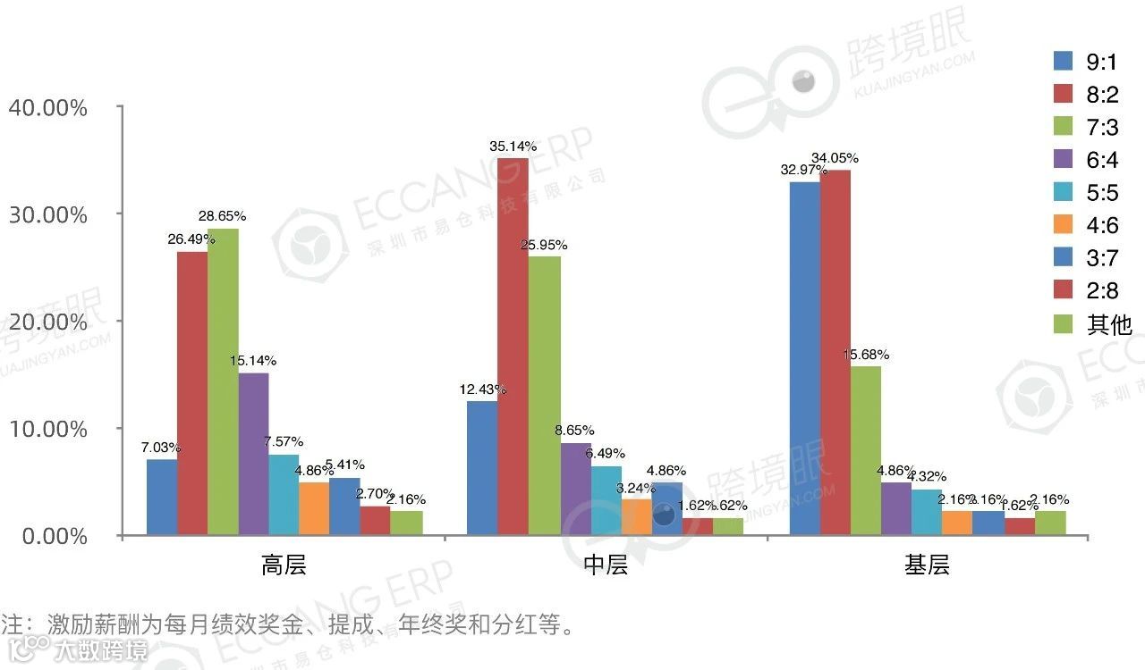 2023年跨境电商行业薪酬结构中固定薪酬和激励薪酬的比例如下图所示。一些企业也喜欢通过灵活的激励政策,对员工形成强有力的引导,例如薪酬结构中高层岗位和基层岗位中,选择“其他”的也分别占到2.16%。
