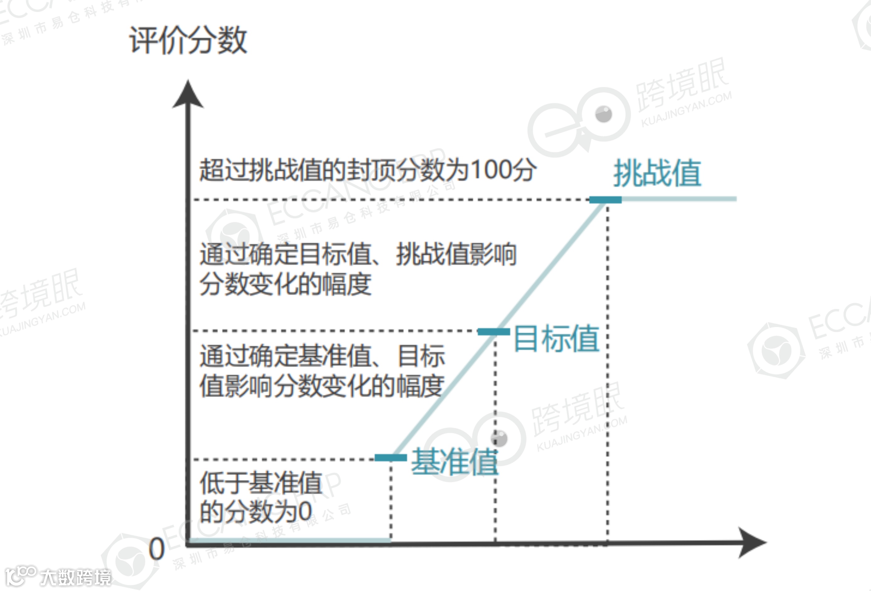 对于定量指标可参考设立基准值、目标值和挑战值三个考核标准,三个考核标准同考核分数的对应关系如下图所示,适用于大多数KPI指标考核成绩的计算。
