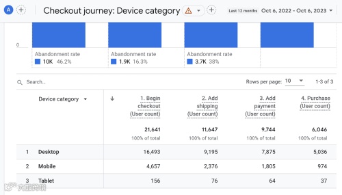 该报告可以识别结帐流程中的瓶颈或问题。例如,在运输步骤后出现大量下降的企业可能在可用的交付选项方面存在技术或定价问题。