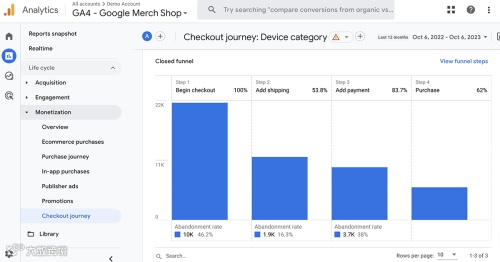 GA4 购买旅程报告提供了对漏斗每个步骤的购物者流失的见解,尽管在结账时的细节较少。这两个报告可以协同工作以识别优化机会。